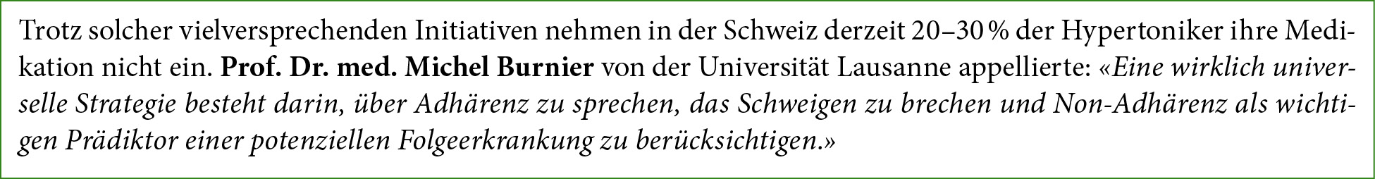 Übereinstimmend sahen die Experten einen der bedeutendsten Hebel zur Verbesserung der Adhärenz im Einsatz von antihypertensiven medikamentösen Kombinationspräparaten. Hierdurch würden die Komplexität des Therapieplans sowie die Tablettenlast für den Patienten reduziert. Prof. Dr. med. Belén Ponte, Vorstandsmitglied der Schweizerischen Gesellschaft für Hypertonie, erläuterte spezifische Strategien aus der Region Genf. Dabei würden Patienten in Laiensprache auch durch das Pflegepersonal über Hypertonie und die Risiken der Nicht-Adhärenz aufgeklärt. Die bildliche Darstellung potenzieller Folgeerkrankungen aufgrund fehlender Therapietreue hätten sich im Rahmen von edukativen Workshops als besonders effektiv erwiesen. Darüber hinaus wurde durch die Apotheke des Universitätsspitals Genf ein Programm zur Besprechung und Überwachung der Therapietreue implementiert.
