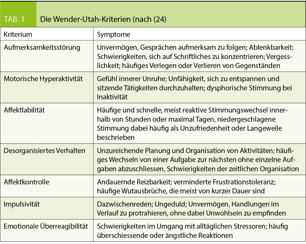 Die Wender-Utah-Kriterien wurden speziell für das Erwachsenenalter konzipiert und berücksichtigen den entwicklungsbedingten Symptomwandel der Betroffenen (24). Dabei werden zur Diagnosestellung neben Aufmerksamkeitsstörung und Hyperaktivität zwei weitere Charakteristika verlangt (Tab. 1).