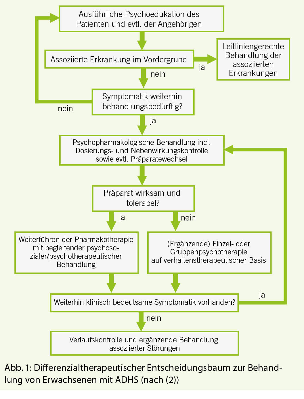 Auch kommt der Abgrenzung der Symptomatik von anderen psychiatrischen Erkrankungsbildern eine grosse Bedeutung zu. So können beispielsweise Konzentrationsstörungen auch im Rahmen affektiver Erkrankungen wie Depressionen auftreten. Dabei weisen diese jedoch typischerweise einen phasenhaften Verlauf auf, wohingegen die Symptomatik der ADHS chronisch persistiert. Auch die Abgrenzung von Borderline-Persönlichkeitsstörungen kann aufgrund teilweise überlappender Symptome schwierig sein. Nicht selten kommt es auch zu einem komorbiden Auftreten der genannten Erkrankungen (2, 9). In der Abb.1 ist ein differenzialtherapeutischer Entscheidungsbaum zur Behandlung von Erwachsenen mit ADHS vorgeschlagen.