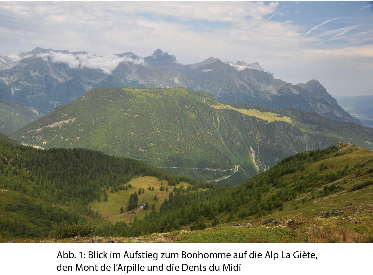 Zu Beginn verläuft der Weg fast eben aus und beginnt nur allmählich anzusteigen, bis er sich in mehreren steilen Kehren durch den Bergwald bis zur Alp La Giète hinaufwindet. Diese liegt im engen Kessel von La Lui unterhalb des Gratrückens, den wir später auf dem Weg zum Gipfel des Bonhomme begehen werden. Glockengeläute empfängt uns auf der Alplichtung und die Eringerkühe sprenkeln schwarz die kargen Weiden oberhalb der Alphütten.