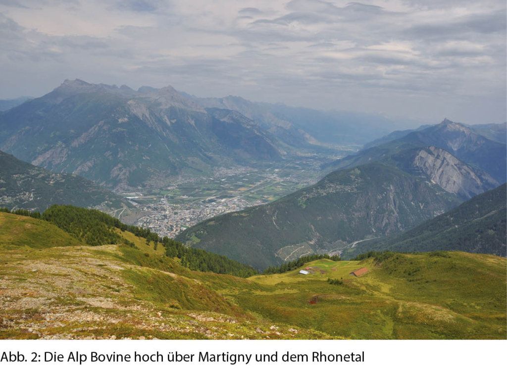 Bis in den kleinen Sattel vor der Kuppe 2259 Meter halten wir uns an die Aufstiegsroute. Wir queren deren Südosthang bis zum Kreuz auf 2098 Meter Höhe. Von da weg folgen wir vorerst dem Gratrücken gegen Nordosten bis zum nächsten Sattel und steigen dann direkt zu den Alphütten von Bovine ab, die zwischen Juni und September offen ist und Unterkunft sowie Verpflegung anbietet (Abb. 2).