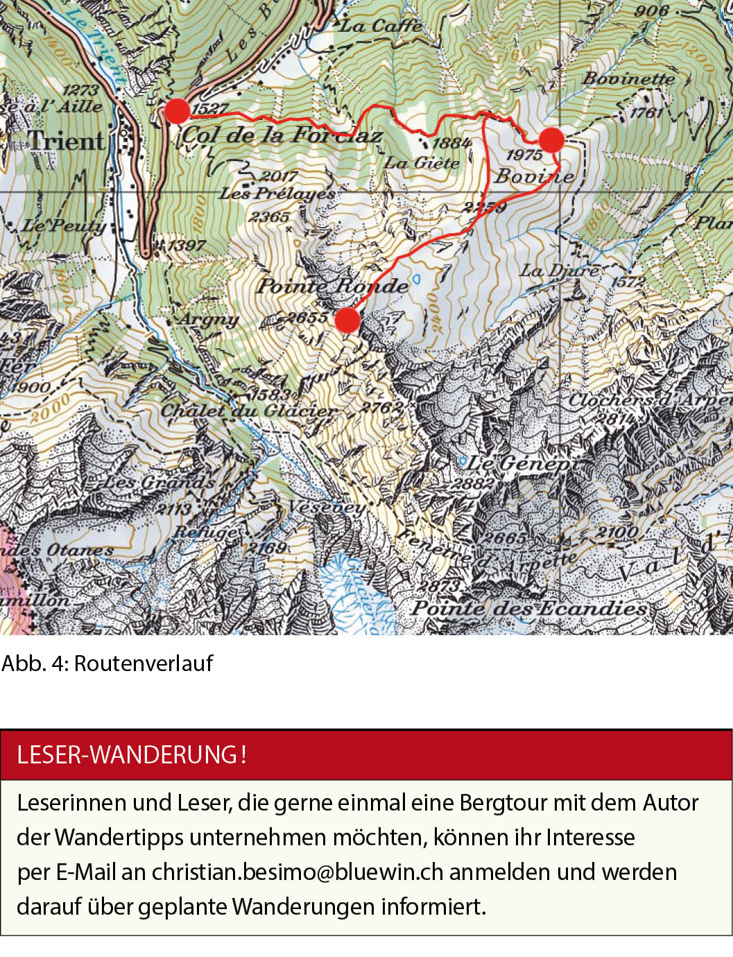 Hier erfrischen wir uns mit einem kalten Getränk, bevor wir auf gleichem Weg zum Col de la Forclaz zurückkehren (Abb. 4). Rasch aufziehende Gewitterwolken bewahren uns auch jetzt vor einer grösseren Völkerwanderung. Auf dem Bonhomme braucht man sich dafür kaum vor einer grösseren Menschenansammlung zu fürchten. In der Regel hat man diesen Gipfel für sich oder teilt ihn mit Gleichgesinnten.