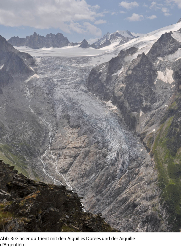 Atemberaubend ist nun der Tiefblick in das Tal von Trient und auf den zerschrundenen, in den letzten Jahrzehnten stark zurückgegangenen Glacier du Trient. An den steilen Hängen der gegenüberliegenden Talseite kleben die Alphütten von Les Petoudes und Les Grands, wo die gleichnamige Schutzhütte der SAC-Sektion Les Diablerets liegt. Ein herrlicher Höhenweg, den wir bereits früher einmal beschrieben haben, verbindet diese Hütte mit jener auf dem Col de Balme.