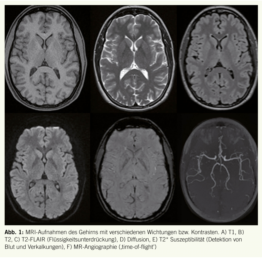 Die meisten neurologischen Fragestellungen werden heutzutage mittels MRI abgeklärt. Insbesondere für die Beurteilung der zerebralen Strukturen ist der hohe Weichteilkontrast und die Möglichkeit, mit verschiedenen Geräteparametern spezifische Kontraste zu erzeugen, ein entscheidender Faktor. Zudem liefern MRI Techniken wie die Diffusions- und Perfusionsanalyse sowie die Spektroskopie weitere Informationen auf molekularer Ebene zur Charakterisierung von gefundenen Strukturalterationen (Abb. 1).
