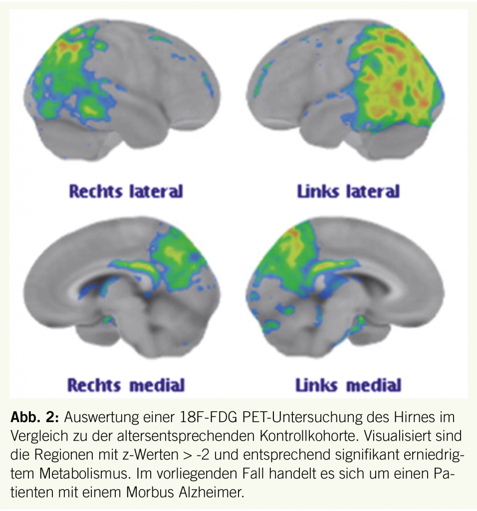 Häufige Indikationen für eine MRI Untersuchung sind neben fokalen neurologischen Defiziten, wie sie zum Beispiel bei Ischämien, entzündlich-demyelinisierenden Erkrankungen oder Tumoren vorhanden sind, die Abklärung von Schwindel und Gangunsicherheiten, Seh-, Hör- und Riechproblemen, hypophysäre Hormonstörungen, Kopfschmerzen oder Trigeminusneuralgien. Zur weiteren Beurteilung von dementiellen Entwicklungen oder Bewegungsstörungen werden häufig volumetrische Auswertungen der grauen Substanz durchgeführt, um signifikante Abweichungen vom entsprechenden Alterskollektiv zu erkennen und zu quantifizieren. Aufgrund der früher und spezifischer detektierbaren Veränderungen auf molekularer Ebene werden bei den entsprechenden Abklärungen häufig zusätzliche nuklearmedizinische Techniken wie die PET mit FDG (Fluorodeoxyglukose) zur Einteilung der Demenzformen (Abb. 2,
