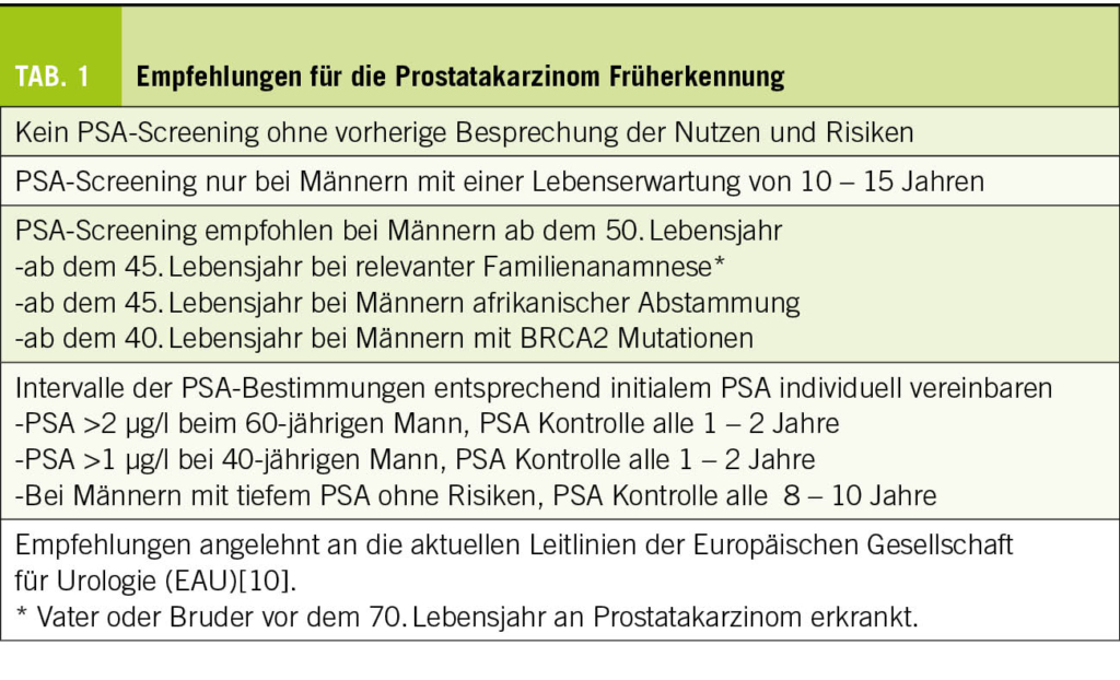 Die primären Ziele des Prostatakarzinom-Screenings sind die Senkung der Sterblichkeit sowie die Erhaltung der Lebensqualität. Entsprechend den Empfehlungen der europäischen Gesellschaft für Urologie (EAU) wird empfohlen, ab dem 50. Lebensjahr mit dem Prostatakarzinom-Screening zu beginnen. Bei erhöhtem Risiko wird ein Screening ab dem 45. Lebensjahr empfohlen, dazu gehören Männer mit relevanter positiver Familienanamnese (Vater oder Bruder vor dem 70. Lebensjahr an Prostatakarzinom erkrankt) und Männer afrikanischer Abstammung. Bei Männern mit BRCA2 Mutation besteht die Empfehlung zum Screening bereits ab dem 40. Lebensjahr (Tab. 1). Da das Prostatakarzinom ein langsam wachsendes Malignom ist, wird das Screening nur bei einer verbleibenden Lebenserwartung von mindestens 10 – 15 Jahren empfohlen. In der Literatur wird daher oftmals die Obergrenze von 70 Jahren aufgeführt, wobei bei biologisch jüngeren, respektive gesünderen Patienten ein Screening auch später sinnvoll sein kann. Umgekehrt sollte bei jüngeren Patienten mit relevanten Komorbiditäten nach entsprechender Abwägung ebenfalls von einer PSA-Bestimmung abgesehen werden (sog. «competing risks»). Diese Überlegungen sollten idealerweise vor einer PSA-Bestimmung durchgeführt werden, um unnötige Tests und die daraus resultierenden Behandlungsentscheidungen zu vermeiden.