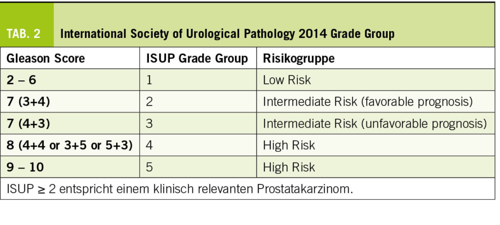Eine PSA-Elevation, eine suspekte digital-rektale Untersuchung (DRU) oder eine auffällige Magnetresonanztomographie (MRT) der Prostata führen zu einer Prostatabiopsie. Hierbei werden multiple Stanzen aus der Prostata entnommen und anschliessend zur histopathologischen Untersuchung eingeschickt. Im Falle eines Karzinomnachweises wird dies in den «International Society of Urological Pathology» (ISUP) Grade Group 1 bis 5 eingeteilt, was den vorherigen alleinigen Gleason-Score ablöst. ISUP 1 entspricht einem Gleason-Score 3+3=6 Prostatakarzinom und wird als «Niedrigrisiko-Prostatakarzinom» bezeichnet (Tab. 2). Die allermeisten ISUP 1 Prostatakarzinome können mittels aktiver Überwachung betreut werden, sodass Patienten die potenziellen Nebenwirkungen einer kurativen Therapie erspart werden können. Prostatakarzinome welche ISUP 2 und höher sind, werden als sogenannte «klinisch signifikante Prostatakarzinome» beschrieben, für die eine aktive Therapie oftmals indiziert ist. Zwar können streng selektionierte Patienten mit ISUP 2 Tumoren ebenfalls erfolgreich mittels aktiver Überwachung betreut werden (9), aber die Mehrheit der Patienten sollten einer kurativ intendierten ­Therapie zugeführt werden (10).