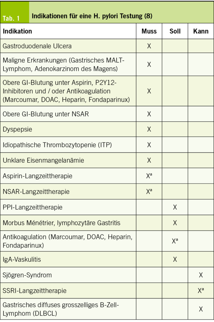 Die aktuelle deutsche Richtlinie unterscheidet zwischen Indikationen einer H. pylori Testung, bei denen getestet werden muss, soll oder kann (Tab. 1). Gastroduodenale Ulcera stellen eine Indikation zur H. pylori Testung dar. Die Diagnose eines gastrischen MALT-Lymphoms oder Adenokarzinom des Magens verlangt ebenfalls eine Testung. Auch bei oberen gastrointestinalen Blutungen unter Aspirin, P2Y12-Inhibitoren, Nicht-steroidalen Antirheumatika (NSAR) oder oraler Antikoagulation muss H. pylori gesucht werden, ebenso bei bisher nicht abgeklärten dyspeptischen Beschwerden. Bei jüngeren Patienten (<50 Jahren) mit dyspeptischen Beschwerden ohne Vorhandensein von Alarmzeichen (z.B. Gewichtsverlust, Anämie, gastrointestinale Blutungsstigmata, Dysphagie, etc.) kann die Testung nicht-invasiv erfolgen. Bei älteren Patienten (>50 Jahre) oder Alarmzeichen muss im Rahmen der Dyspepsie-Abklärung immer eine Gastroskopie erfolgen. Weitere zwingende Indikationen für die H. pylori Testung stellen eine nicht anderweitig erklärte oder Therapie-refraktäre Eisenmangelanämie und die idiopathische thrombozytopene Purpura (ITP) dar. Vor geplanter Aspirin- oder NSAR-Langzeittherapie muss getestet werden, sofern ein Risikoprofil für gastroduodenale Ulcera und Ulcuskomplikationen (u.a. Alter >60 Jahre, bereits Ulcera in der Vergangenheit, Einnahme von NSAR/Aspirin, inflammatorische Erkrankungen des Gastrointestinaltrakts, schwere Grunderkrankungen, etc.) vorliegt. Bei Patienten mit IgA-Vaskulitis, Morbus Ménétrier, lymphozytärer Gastritis sowie geplanter Langzeit Antikoagulation sollte ebenfalls auf H. pylori getestet werden. Eine Langzeit-Therapie mit einem Protonenpumpeninhibitor (PPI) führt im Falle einer H. pylori Infektion zu einer Corpus-dominanten Gastritis und erhöht damit das Risiko für die Entwicklung eines Adenokarzinoms des Magens. Daher sollte auch in diesem Fall getestet werden (8, 9).