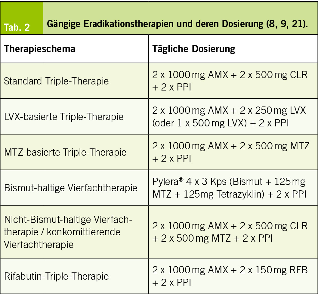 Für die H. pylori Eradikation stehen verschiedene Therapieschemata zur Verfügung (Tab. 2). Als gängiges Schema kommt die Standard-Triple-Therapie aus AMX, CLR und PPI zum Einsatz, wobei CLR alternativ durch Levofloxacin (LVX) ersetzt werden kann. Die LVX-basierte Triple-Therapie kann auch um Bismut zur Vierfachtherapie erweitert werden. Alternativ kann eine Metronidazol (MTZ)-basierte Triple-Therapie mit AMX, MTZ und PPI erfolgen. Eine weitere Option stellt die Bismut-haltige Vierfachtherapie aus Bismut, Tetrazyklin und MTZ plus PPI dar. Hier steht das 3-in-1 Kombinationspräparat, Pylera®, zur Verfügung. Unter der konkomittierenden Vierfachtherapie, auch Nicht-Bismut-haltige Vierfach-therapie genannt, versteht man eine Kombination aus PPI, CLR, AMX und MTZ. Weiters besteht die Option einer Rifabutin (RFB)-Triple-Therapie aus RFB, AMX und PPI. Für die Triple-Therapien und konkomittierende Vierfachtherapie ist klar eine Therapiedauer von 14 Tagen empfohlen, da mit einer längeren Therapiedauer höhere Eradikationserfolge erzielt werden können (8, 9). Für die Bismut-haltige Vierfachtherapie wird eine Therapiedauer von 10 bis 14 Tagen empfohlen, wobei hinsichtlich hoher MTZ-Resistenzraten ebenfalls eine längere Therapiedauer präferiert werden sollte (9, 20).