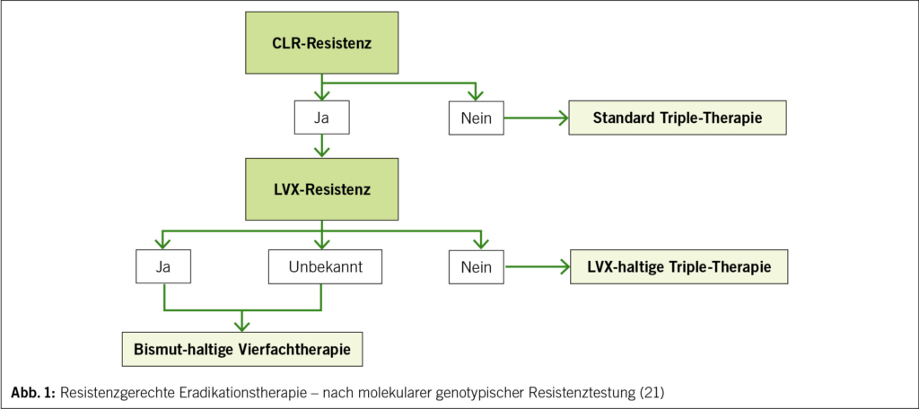 Die im letzten Jahr erschienene schweizerische Richtlinie empfiehlt klar eine resistenzgerechte Erstlinientherapie. Es wird zwischen der molekularen genotypischen Resistenztestung (zwei Antibiotika) und der phänotypischen Resistenztestung (sechs Antibiotika nach Kultur von H. pylori) unterschieden. Nach molekularer Resistenztestung ohne Nachweis einer CLR-Resistenz ist eine Standard-Triple-Therapie empfohlen (Abb. 1). Im Falle einer CLR-Resistenz und LVX-Sensibilität sollte eine LVX-basierte Triple-Therapie gewählt werden. Bei CLR-Resistenz und unbekannter LVX Resistenzlage sowie bei CLR- und gleichzeitiger LVX-Resistenz ist eine Bismut-haltige Vierfachtherapie empfohlen. Vorteil der phänotypischen Resistenztestung ist, dass auf vier weitere Antibiotika getestet werden kann, was vor allem bei vorangegangenen, nicht erfolgreichen Eradikationstherapien sinnvoll ist. Die vollständige Tabelle mit Therapieempfehlungen nach phänotypischer Resistenztestung kann in der aktuellen Richtlinie der Schweizer Gesellschaft für Infektiologie eingesehen werden (21).