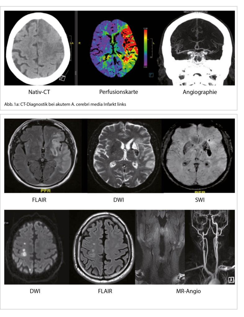 Wenn nach der ersten anamnestischen und klinischen Beurteilung die klinische Vermutung auf einen akuten Hirnschlag vorliegt, ist im Hinblick auf eine revaskularisierende Therapie der Ausschluss einer intrakraniellen Blutung sowie einer nicht vaskulären Pathologie wichtig. Gleichzeitig beginnt auch die Abklärung der Schlaganfall-Ätiologie. Dazu ist eine erste Bildgebung mittels CT- oder MRI-Untersuchung notwendig. Die Entscheidung zwischen CT oder MRI in der akuten Phase ist stark von Klinikressourcen und Zeit-Effizienz des entsprechenden Behandlungsprotokolls abhängig. Eine Vorgehensweise mit CT-Scan beinhaltet erst ein natives CT (ohne Kontrastmittelgabe), um eine intrakranielle Blutung als Ätiologie des Ereignisses auszuschliessen. Dafür ist das CT-Scan sehr zeiteffizient und präzise. Danach folgt die Kontrastmittel-Gabe mit CT-Angiographie, um den Status der hirnversorgenden Gefässe zu beurteilen und einen potentiellen Gefässverschluss zu diagnostizieren. Zuletzt dient die Perfusions-Untersuchung dazu, das Volumen des möglichen rettbaren Hirngewebes zu bestimmen und eine revaskularisierende Therapie zu indizieren (Abb. 1a). Eine MRI-Erstbildgebung ist sensitiver für die Hirnschlagdiagnose, da sehr früh das ischämische Gewebe erkannt werden kann. Die kernspintomographische Vorgehensweise beinhaltet diffusionsgewichtete (DWI) und suszeptibilitätsgewichtete (SWI) Aufnahme-Protokolle, die jeweils zwischen einem ischämischen und hämorrhagischen Ereignis differenzieren und eine genaue Lokalisation der Läsion geben können. Ergänzend dazu geben die ADC und FLAIR Protokolle hilfreiche Informationen bezüglich des zeitlichen Verlaufs der Läsion. Der Gefäss-Status kann im Hinblick auf signifikante Stenosen oder anderen Gefässerkrankungen wie Dissektionen, Vaskulitiden etc. mittels einer MR-Angiographie beurteilt werden (Abb. 1b, 2) (2, 3).