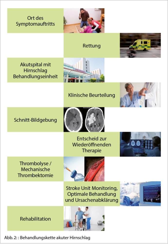 Die Behandlung des akuten Hirninfarktes ist zeitkritisch. Alle nötigen Prozesse und Entscheidungen müssen so schnell wie möglich getroffen werden. Mitentscheidend für das klinische Ergebnis ist bereits das Erkennen durch Laien. Die Hirnschlag-Differentialdiagnose beginnt beim ersten Kontakt mit der Rettung. Hier wird ein erster Verdacht auf einem Hirnschlag gestellt und das Zielspital bereits vor Ankunft alarmiert (1).