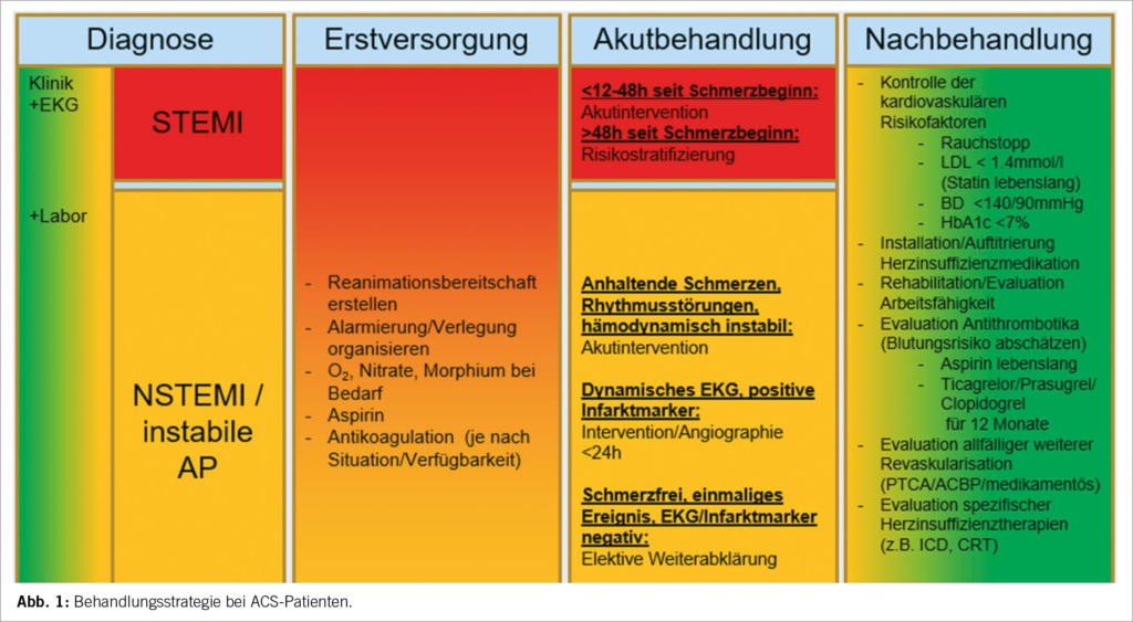 Nach der akuten Management- und Stabilisierungsphase sind die meisten Aspekte der anschliessenden Behandlungsstrategie jedoch für alle ACS-Patienten (unabhängig vom anfänglichen EKG-Muster oder dem Vorhandensein/Fehlen einer kardialen Troponinerhöhung bei der Vorstellung) gemeinsam und können daher unter einem gemeinsamen Pfad betrachtet werden (Abb. 1). Die Nachbetreuung (postinterventionelle Überwachung, stationäre oder ambulante Rehabilitation, sekundärprophylaktische Präventiv-Massnahmen, fachärztliche Weiterbetreuung) ist essenzieller Bestandteil einer langfristig orientierten Patientenversorgung. Dabei werden individuelle Patientenbedürfnisse und krankheits-spezifische Aspekte berücksichtigt. Etablierte Kooperationen (Grundversorger, Rehabilitationszentren, niedergelassene Kardiologen) vereinfachen und optimieren die Nachsorge.