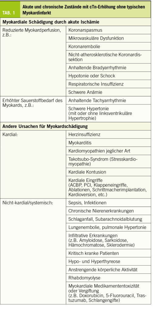 ten universellen Myokardinfarkt-Definition) (2). Bei Patienten mit Myokardinfarkt steigen die cTn-Werte nach Beginn der Symptome schnell an (in der Regel innerhalb von 1 Stunde bei Verwendung von hochsensiblen Assays) und bleiben für eine variable Zeitspanne erhöht (in der Regel mehrere Tage). Die Werte von hs-cTn sollten als quantitative Marker für die Schädigung von Kardiomyozyten interpretiert werden (d.h. je höher der Wert, desto höher die Wahrscheinlichkeit eines Myokardinfarkts): Die Begriffe «positive» und «negative» Troponinwerte sollten vermieden werden. Stattdessen werden bevorzugt «erhöhte» und «nicht-erhöhte» Troponinwerte verwendet. Erhöhungen über das Fünffache des oberen Referenzwertes haben eine hohe (>90%) positive Vorhersagewahrscheinlichkeit (PPV) für einen akuten Myokardinfarkt. Erhöhungen bis zum Dreifachen des oberen Referenzwertes haben nur eine begrenzte (50–60%) PPV für einen Infarkt und können mit einem breiten Spektrum von Zuständen assoziiert sein. Zudem sind erhöhte cTn-Werte auch bei gesunden Personen festzustellen. Aufgrund ihrer hohen Empfindlichkeit können cTn-Werte auch bei akuten und chronischen Zuständen ohne Myokardinfarkt erhöht sein (Tab. 1). Steigende und/oder fallende cTn-Werte unterscheiden einen akuten Myokardinfarkt von chronischer, jedoch nicht von akuter Myokardschädigung anderer Ätiologie.