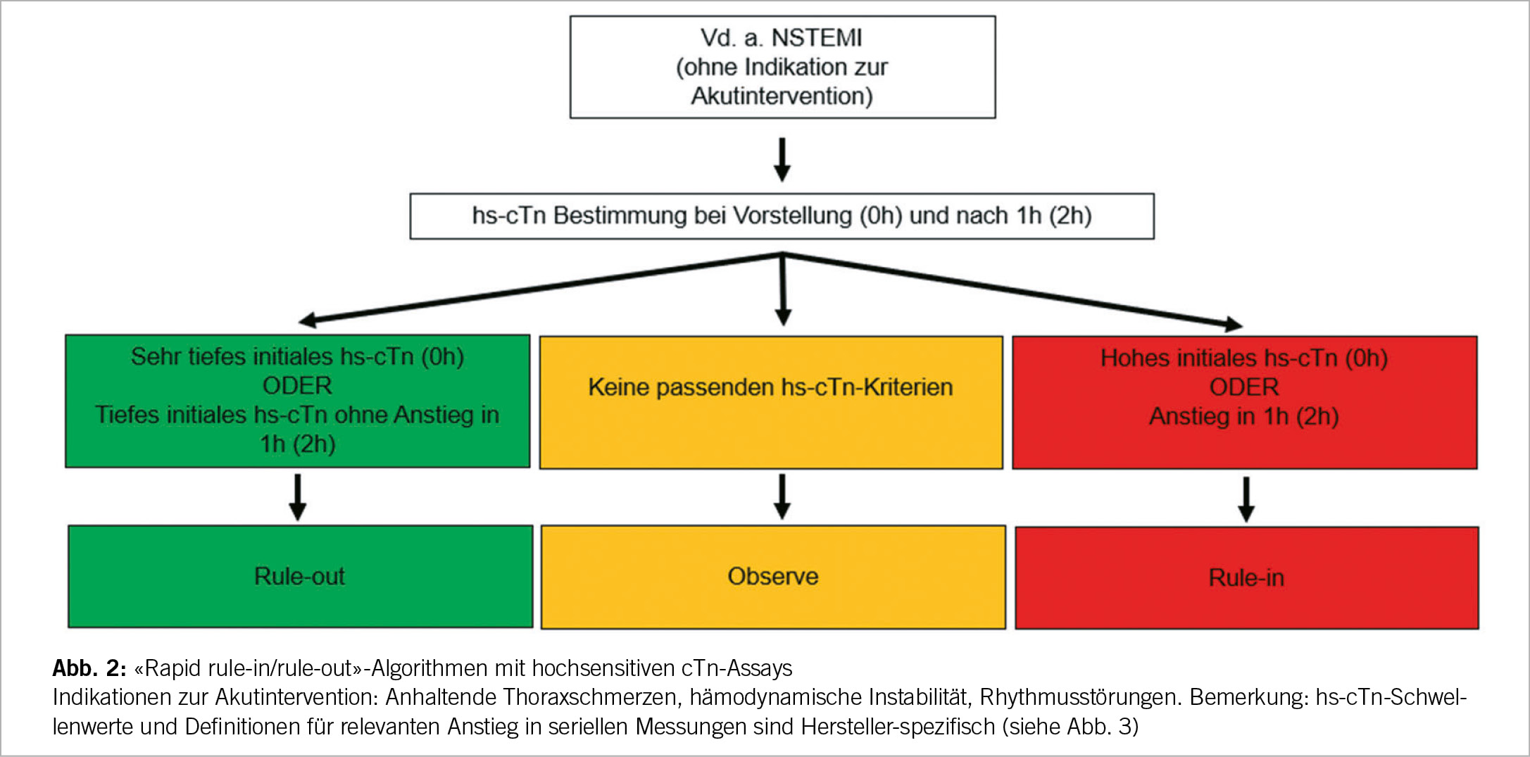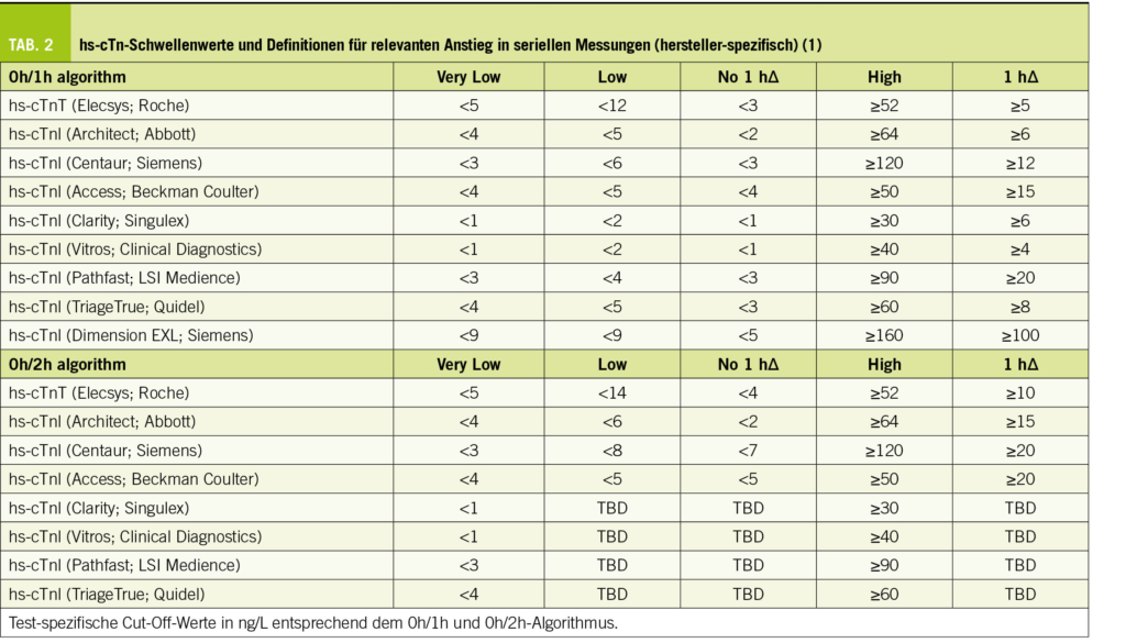 Fortschritte in der Labordiagnostik haben zu einer Verfeinerung der cTn-Assays geführt und ihre Genauigkeit bei der Erkennung und Quantifizierung von Kardiomyozytenschädigungen verbessert. Hochsensitive cTn-Assays erhöhen die diagnostische Genauigkeit für einen Herzinfarkt zum Zeitpunkt der Vorstellung im Vergleich zu konventionellen Assays, insbesondere bei Patienten, die früh nach dem Beginn von Brustschmerzen vorstellig werden, was spezifische diagnostische Algorithmen zum Ausschluss resp. Bestätigung eines ACS/NSTEMI ermöglicht («Rapid rule-in/rule-out»-Algorithmen, Abb. 2): Aufgrund ihrer höheren Empfindlichkeit und diagnostischen Genauigkeit bei der Erkennung von Myokardinfarkten (MI) bei der Vorstellung kann der Zeitraum bis zur zweiten Bestimmung des kardialen Troponins (cTn) mit Hilfe von hochsensitiven (hs) cTn-Tests verkürzt werden. Dies führt zu erheblich verkürzten Diagnoseverzögerungen, was sich in kürzeren Aufenthalten in der Notaufnahme, niedrigeren Kosten und weniger diagnostischer Unsicherheit für die Patienten niederschlägt. Die ESC 0 h/1 h und 0 h/2 h-Algorithmen basieren auf der Idee, dass hs-cTn eine kontinuierliche Variable ist und die Wahrscheinlichkeit eines MI mit zunehmenden hs-cTn-Werten steigt. Die Algorithmen beruhen auf optimalen Schwellenwerten, die in grossen Studien herstellerspezifisch (!) validiert wurden (Tab. 2).