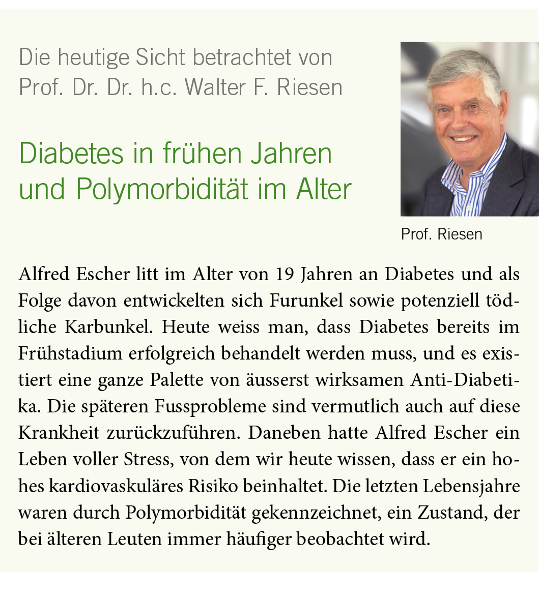 Der Jahrhundertunternehmer und -politiker Alfred Escher wurde zeitlebens von zahlreichen Krankheiten heimgesucht, denen er bis zum Tod mit eisernem Willen die Stirn bot. Als Kind litt er oft an Husten, Fieber und Heiserkeit. 1838/39 erkrankte er als 19-Jähriger an Röteln. In einem Brief schrieb er seinem Schuldkameraden Jakob Escher: «Der Arzt schickte mich… sogleich zu Bette, setzte mir 10 Blutigel an den Kopf und nun zeigte sich ein Ausschlag, der nach sieben Tagen den höchsten Grad erreichte… Entsetzliches Schwitzen folgte jetzt, das mehrmals 12 Stunden lang in einem Tage mich quälte und Drücken und Reissen auf der Brust… 9 Tage lang ass ich – so zu sagen – nichts.»