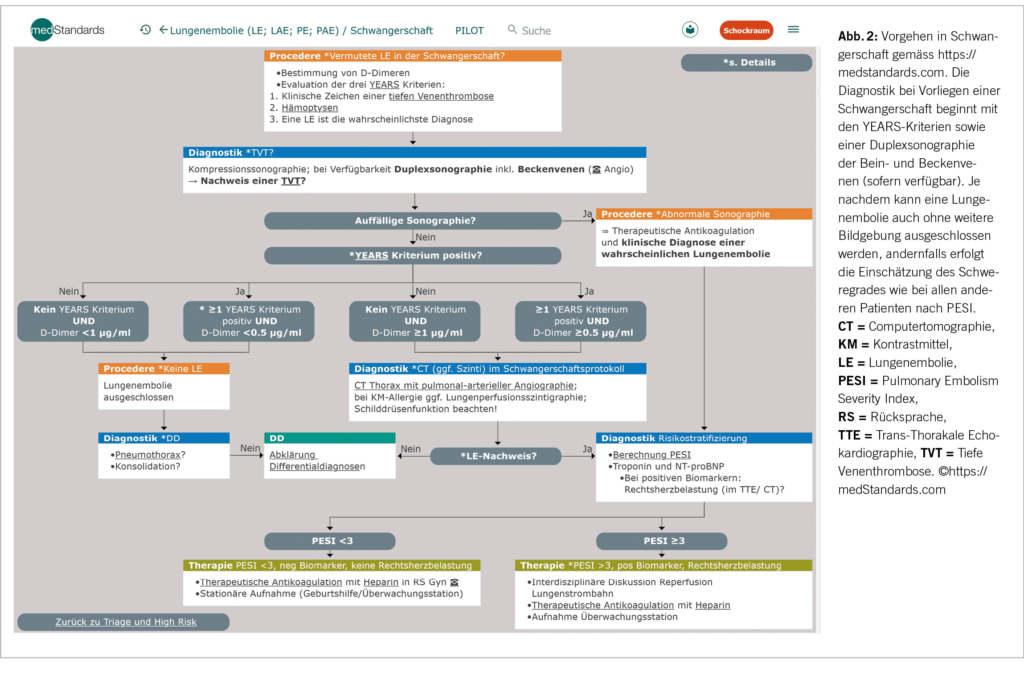 Als vereinfachtes Diagnoseinstrument können gegebenenfalls die Years Kriterien (2) (beinhaltet: Klinik, Hämoptysen, Wahrscheinlichkeit) mit einbezogen werden. Dies vor allem in der Schwangerschaft (Abb. 2), oder um sich bei Nicht-Schwangeren einen zeitsparenden Überblick zu verschaffen. Diese Kriterien benötigen allerdings ausserhalb einer Schwangerschaft sicher noch weiterer Evaluation (3).