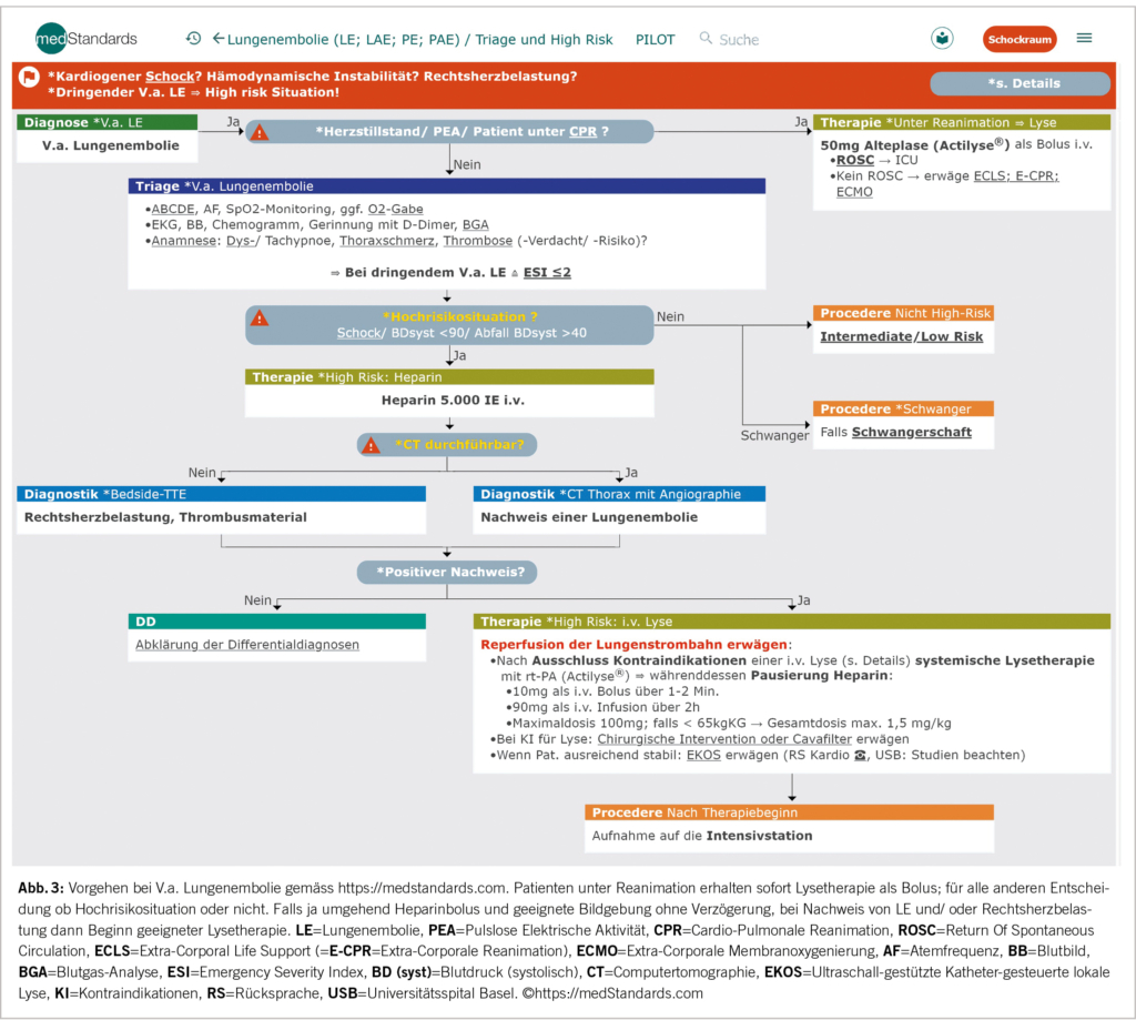 Schnelligkeit und Entschiedenheit zeichnen das Vorgehen bei klinischen Hochrisikopatientinnen und -patienten (Reanimationsbedürftigkeit, Schock) und Abwesenheit anderer wahrscheinlicherer Differenzialdiagnosen aus (Abb. 3). Diese Konstellation spricht für eine relevante Verlegung der Lungenarterienstrombahn durch einen embolisierten Thrombus.