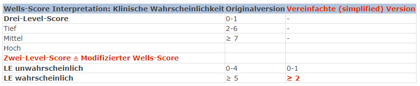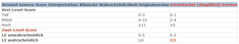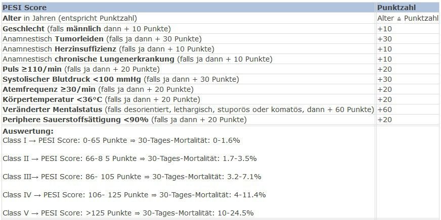 Wird in der darauffolgenden Bildgebung eine Lungenembolie gefunden, folgt bei hämodynamischer Stabilität die Interpretation unter Berücksichtigung von Klinik und Komorbiditäten. Dazu ist die Schweregrad-Einteilung beziehungsweise Risiko-Klassifizierung hinsichtlich Mortalitätsrisiko in Low Risk, Intermediate-Low Risk, Intermediate-High Risk (und High Risk = Instabilität, hohes Mortalitätsrisiko) wichtig. Dies geschieht durch Berechnung des (simplified) PESI Scores mittels klinischer und anamnestischer Faktoren (Alter, Geschlecht, Vitalparameter, Vorgeschichte).