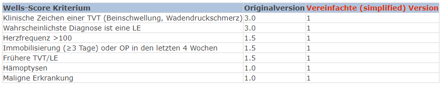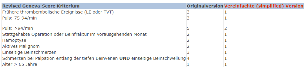 Kommt man mittels oben genannten Scores und Klinik auf eine niedrige Vortestwahrscheinlichkeit von <15% (4) (und nur dann!) kann man mit der PERC Rule (beinhaltet: Alter, Puls, Sauerstoffsättigung, einseitige Beinschwellung, Hämoptysen, St. n. Trauma/Operation, St. n. venöser Thromboembolie, Hormontherapie) für Lungenembolien weiterfahren (5). Zu beachten ist hier die eher niedrige Prävalenz der Validierungsstudien.
