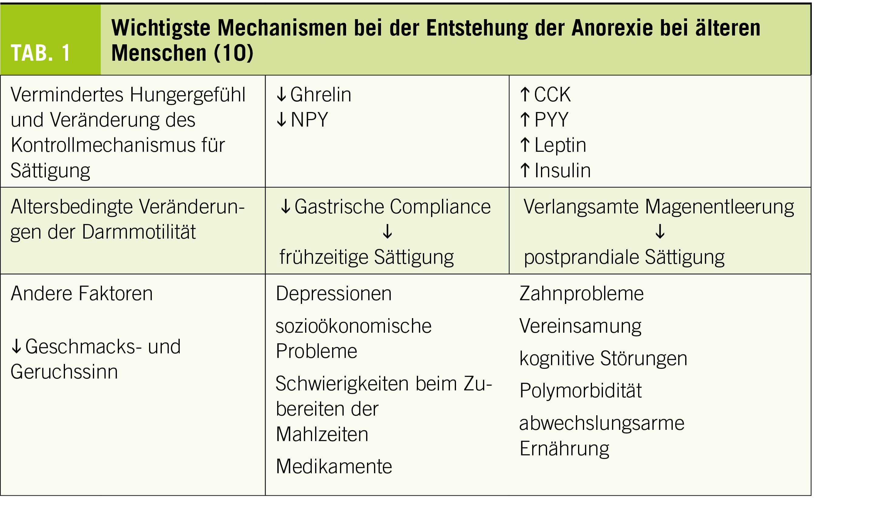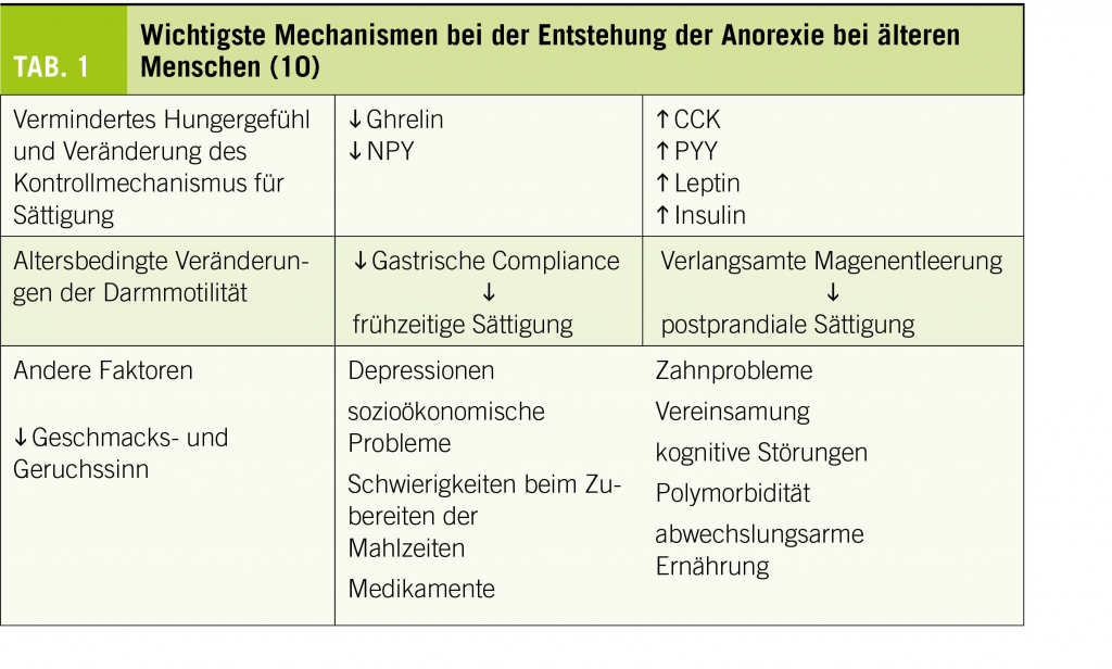 Tabelle 1 fasst die wichtigsten Mechanismen der Anorexie bei älteren Menschen zusammen.