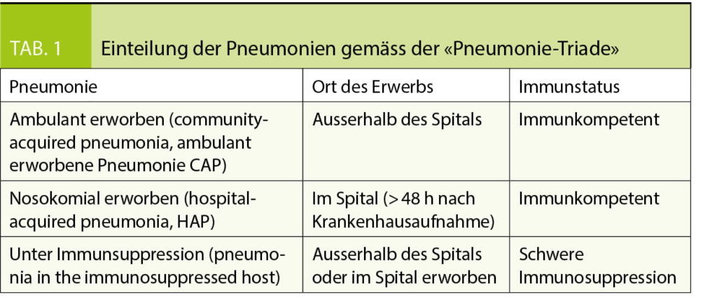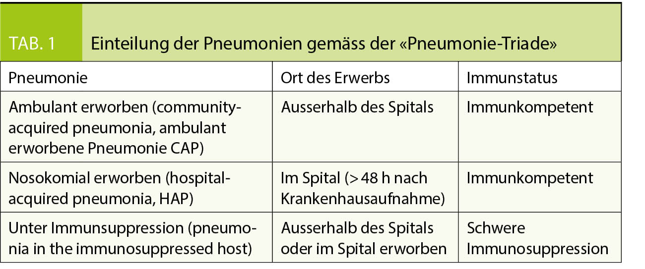 Pneumonien werden in der sogenannten «Pneumonie-Triade» eingeteilt (Tab. 1). Die ambulant erworbene Pneumonie ist definiert als eine Pneumonie, die durch den Ort des Auftretens (ausserhalb des Spitals) sowie die Immunität des Patienten (Immunkompetenz) bestimmt wird.