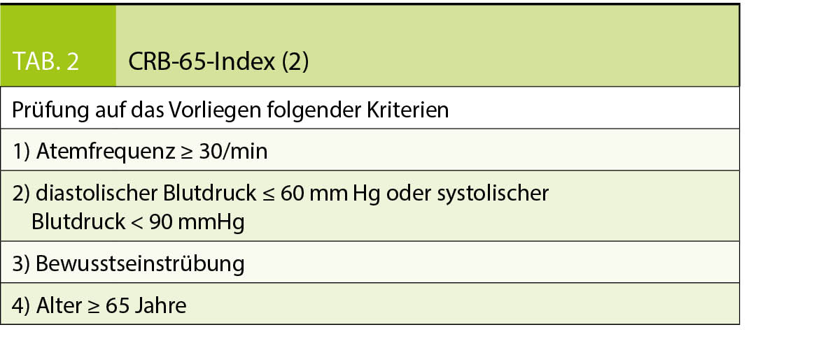 Als einfacher Score mit guter Prädiktion des Letalitätsrisikos hat sich der CRB-65-Index (Tab. 2) etabliert. Er wird über die unkomplizierte Bestimmung von drei klinischen und einem anamnestischen Parameter gebildet und ist auch ambulant gut anwendbar. Der Score wird berechnet durch die Addition eines Punktes für das Vorliegen jeweils eines der in der Tabelle 2 aufgelisteten Kriterien. Der CRB-65-Index wurde in zahlreichen Studien und mehreren aktuellen Metaanalysen validiert und zeigt eine gute Abschätzung der zu erwartenden Letalität.