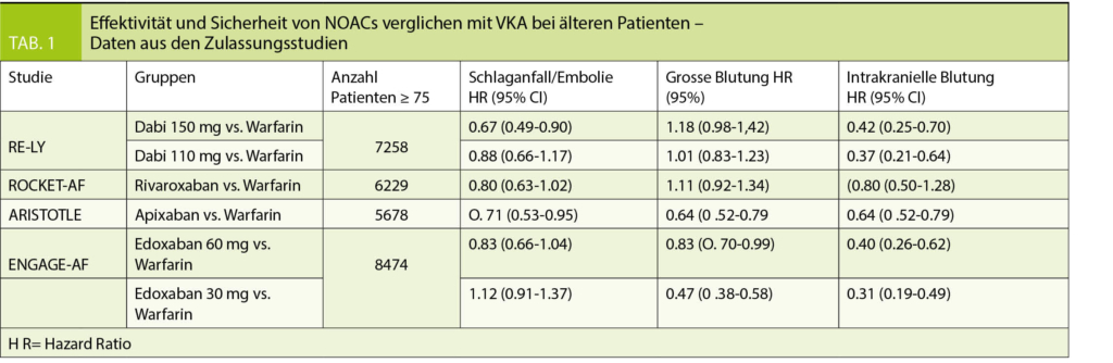 Eine weitere Meta-Analyse bestätigte die gegenüber VKA ebenbürtige oder überlegene anti-thrombotische Effektivität von NOACs bei älteren Patienten (21). Allerdings traten gastrointestinale Blutungen unter beiden Dabigatran Dosierungen numerisch häufiger auf, während intrakranielle Blutungen unter beiden Dosierungen seltener waren. Signifikant tiefere Blutungsraten verglichen mit VKA wurden für Apixaban und Edoxaban verzeichnet, während Rivaroxaban ähnlich zu VKA abschnitt.