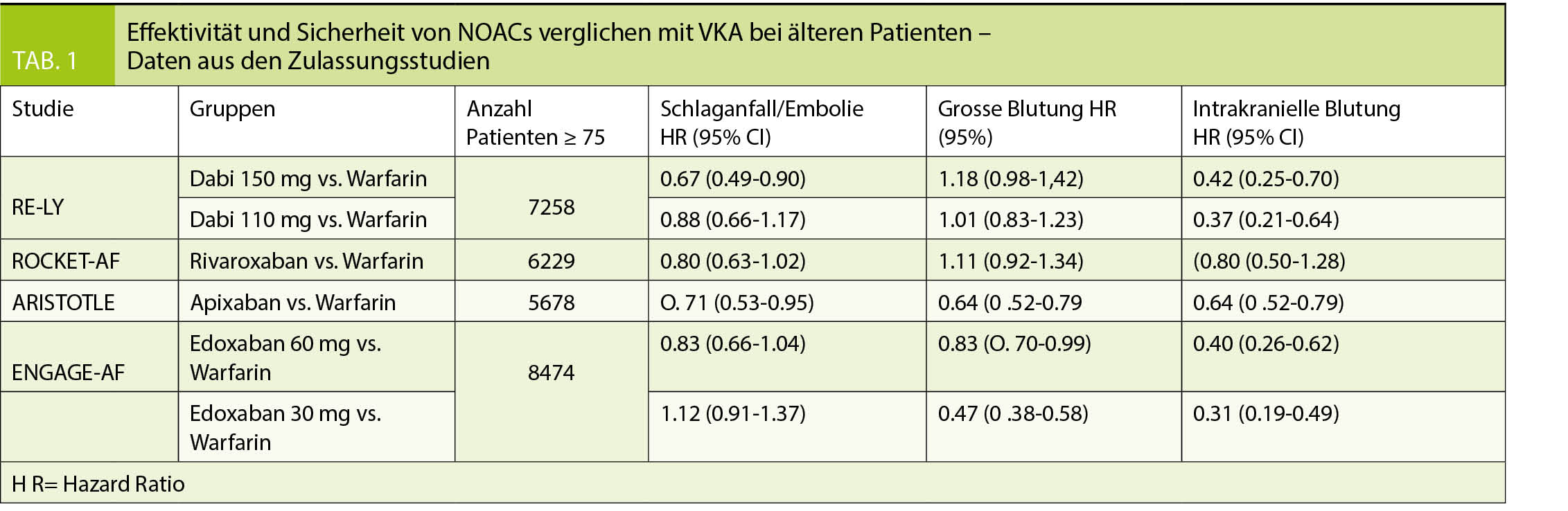 tienten wurden VKA mit Aspirin verglichen. Hierbei führten VKA zu einer signifikanten (52%) Reduktion des relativen Risikos für den gemeinsamen Endpunkt von Schlaganfall, systemischer Embolie oder intrakranieller Blutung (10). Sogenannte «real world» Daten bestätigten später die Reduktion thromboembolischer Komplikationen unter OAK verglichen mit Aspirin, wobei das Blutungsrisiko nicht erhöht wurde. Entsprechend nahmen die klinischen Netto-Vorteile einer OAK mit steigendem Alter gar zu (9). Diese Ergebnisse wurden in einer Meta-Analyse mit 13 559 VHF-Patienten bestätigt (11).