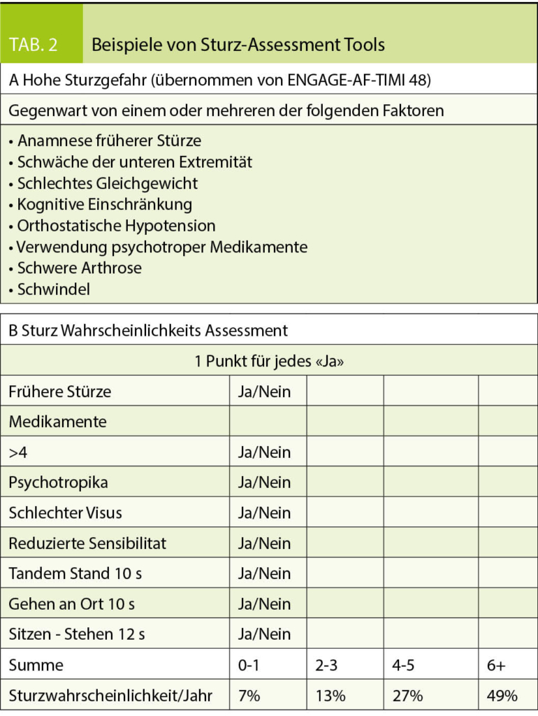 Die altersbedingte Sturzgefahr wird häufig als Kontraindikation für OAK gewertet (17). Interessanterweise hat ein analytisches Modell gezeigt, dass ein Patient unter VKA 295 Mal stürzen müsste, bevor das Risiko eines Subduralhämatoms die Vorteile der OAK überwiegen würde (38). Angesichts der tieferen intrakraniellen Blutungsrate unter NOACs, dürfte die «number needed to fall» hier noch grösser sein. Der Effekt von NOACs versus VKA bei Patienten mit erhöhter Sturzgefahr wurde in zwei NOAC Studien spezifisch untersucht (ENGAGE-AF TIMI 48 und ARISTOTLE). Hierbei war der Behandlungserfolg der NOACs gegenüber VKA auch bei sturzgefährdeten Patienten konsistent. Da diese aber auch ein grösseres absolutes Risiko für thromboembolische Komplikationen hatten, war die absolute Risikoreduktion unter NOACs verglichen mit VKA ausgeprägter, sodass die «number needed to treat» bei sturzgefährdeten Patienten noch tiefer ausfiel (8, 39). Entsprechend sollte Gebrechlichkeit per se nicht als Ausschlusskriterium für OAK geltend gemacht werden, da gerade diese Patienten ein erhöhtes Risiko für Schlaganfall aufweisen und entsprechend profitieren können. Edoxaban und Apixaban sind die in diesem Zusammenhang am besten untersuchten NOACs. Weiterhin empfiehlt es sich, bei allen älteren Patienten mit OAK Indikation das Sturzrisiko mittels entsprechender Risiko-Tools zu ermitteln (Tabelle 2), häufige Stürze interdisziplinär abzuklären und das Sturzrisiko durch gezielte Interventionen (Bewegungsprogramme, Heimabklärung) zu reduzieren.