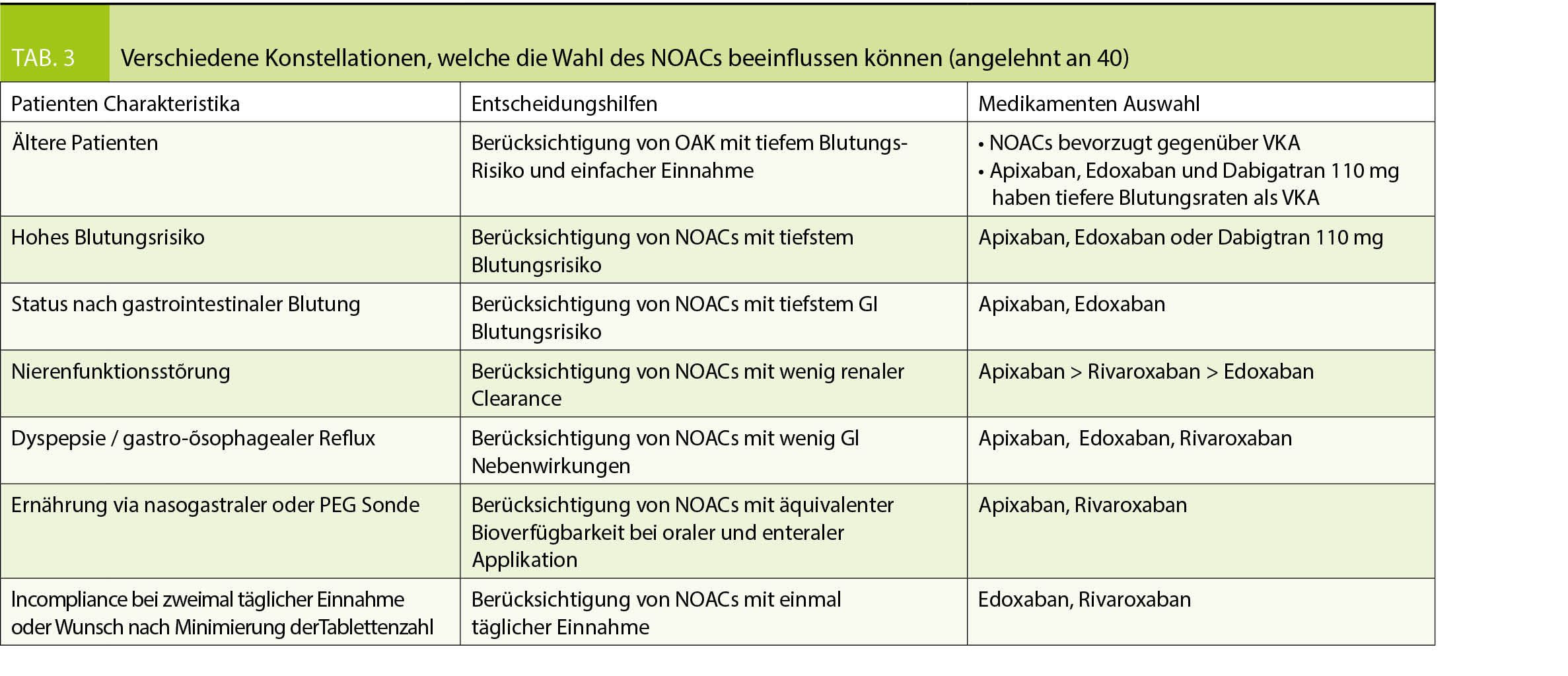 Bezüglich Auswahl des geeigneten NOACs für den individuellen Patienten gibt es keine allgemeingültige Standardlösung. Von direkten Vergleichen der Substanzen untereinander sollte möglichst abgesehen werden, da sich die Zulassungsstudien bezüglich Ein- und Ausschlusskriterien und Definition der Endpunkte unterscheiden. Dennoch können gewisse patientenspezifische Faktoren besondere Ansprüche an das verschriebene NOAC stellen, welche in die Wahl der geeigneten Substanz einfliessen (40). Tabelle 3 gibt eine Übersicht über mögliche Konstellationen.