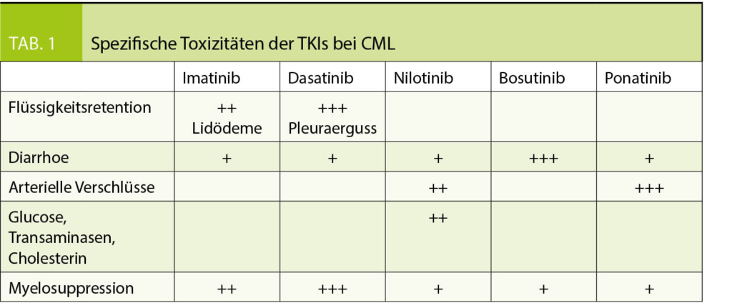 In den meisten Fällen liegt bei Diagnose eine chronische Phase der CML vor. Dafür sind vier TKIs zugelassen. Die robustesten Daten zur Langzeit-Toxizität gibt es für Imatinib, weshalb die meisten Experten zumindest bei niedrigem CML-Risiko-Score die Therapie damit beginnen. Der CML Risiko-Score basiert auf dem Patientenalter, der Milzgrösse unter dem Rippenbogen sowie der Blasten- und Thrombozytenzahl im Blut. Unter https://www.leukemia-net.org/content/leukemias/cml/elts_score/index_eng.html findet sich ein online-calculator für den aktuell gebräuchlichen ELTS-Risiko-Score. Liegt eine CML mit hohem Risiko-Score vor, wird aufgrund der schnelleren und stärkeren Wirkung ein TKI der 2. Generation, also Dasatinib (Sprycel®), Nilotinib (Tasigna®) oder Bosutinib (Bosulif®) bevorzugt. Bei der Medikamentenwahl ist aber stets die Komorbidität des Patienten zu berücksichtigen. So sind aufgrund der spezifischen Toxizität gewisse TKIs bei gewissen Patienten kontraindiziert (Tab. 1).