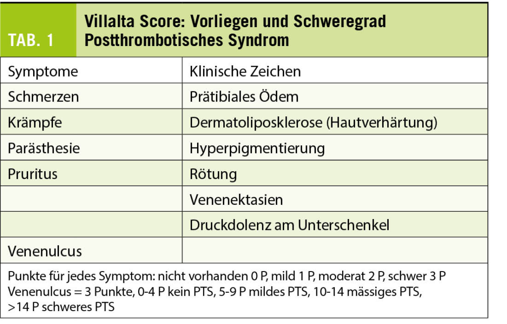 Insbesondere bei proximaler TVT (iliaco-femoro-popliteal) ist aufgrund des erhöhten Risikos eines PTS eine Kompressionstherapie empfohlen. Die Dauer soll individuell nach Klinik, Schwellung, Restthrombuslast/Rekanalisation und Ausmass der postthrombotischen Klappensuffizienz angepasst werden. Bei Verdacht auf ein PTS soll die Erfassung vom Schweregrad mittels Villalta Score erfolgen, um den Verlauf zu dokumentieren. Die Kompressionsbehandlung ist bei Patienten mit peripherer arterieller Verschlusskrankheit im Stadium III und IV nach Fontaine kontraindiziert (Tab. 1).