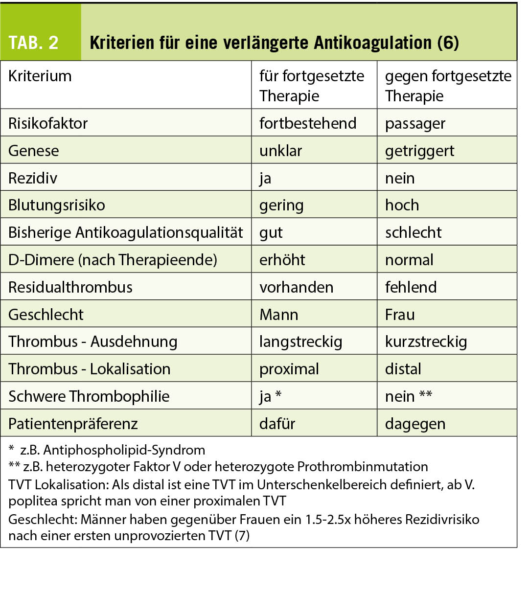 Vor Absetzen der Antikoagulation sollte, wenn immer möglich, eine duplexsonografische Verlaufskontrolle mit Frage nach Restthrombuslast / Grad der Rekanalisation resp. postthrombotischer Venenklappeninsuffizienz durchgeführt werden. Bei einer Restthrombuslast von > 40% (6) in der Verlaufskontrolle oder hohem Risikoprofil für ein Rezidiv (männliches Geschlecht, Alter, Adipositas, bei Frauen: erhöhte D-Dimere) ist die Fortführung der AK entsprechend dem Blutungsrisiko empfohlen (Tab. 2).