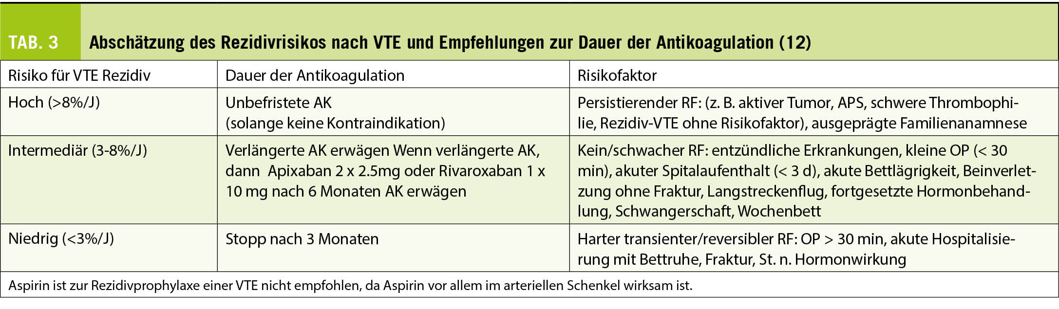 Etwas differenzierter wird unterteilt in ein hohes, intermediäres und niedriges Rezidivrisiko bei der VTE, je nachdem, ob ein Provokationsfaktor vorliegt und/oder welcher Art die Risikofaktoren für ein Rezidiv sind. Bei transientem Provokationsfaktor geht man von einem niedrigen Rezidivrisiko aus, weshalb die AK nach 3 Monaten sistiert werden kann. Zur intermediären Risikogruppe gehören Patienten mit unprovozierter VTE und nicht klar eruierbaren Risikofaktoren (vgl. Tabelle unten) (12).