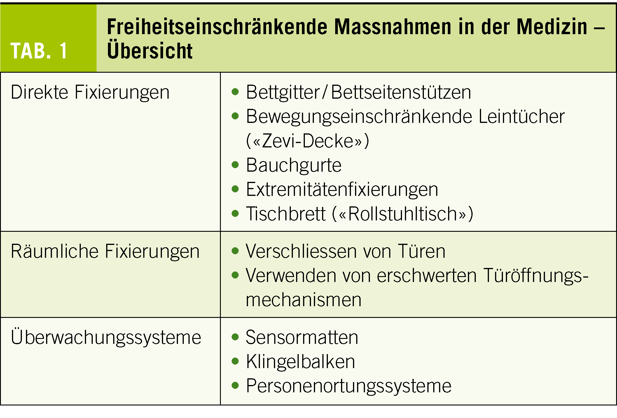 Menschen mit Demenz zeigen nicht selten Verhaltensweisen, mit denen sie sich selber oder gelegentlich auch andere Personen gefährden. Oftmals stehen diese Verhaltensweisen im Zusammenhang mit nicht-kognitiven Symptomen der Demenz, also den sog. behavioural and psychological symptoms of dementia (BPSD), zu Deutsch Störungen der Emotionen und des Verhaltens (4). Motorische Unruhe im Zusammenhang mit einer verminderten posturalen Kontrolle kann zu einer Sturzgefährdung führen, Agitation und Enthemmung zu Aggression und Zusammenstössen mit anderen Menschen, etc. In diesem Zusammenhang stellt sich dann nicht selten die Frage des Einsatzes von sog. freiheitseinschränkenden Massnahmen (FeM). Hierbei wird unterschieden zwischen direkten Fixierungen und räumlicher Fixierung, im weiteren Sinne werden auch alle Formen von Personenüberwachungssystemen zu den FeM gerechnet (Tab. 1).