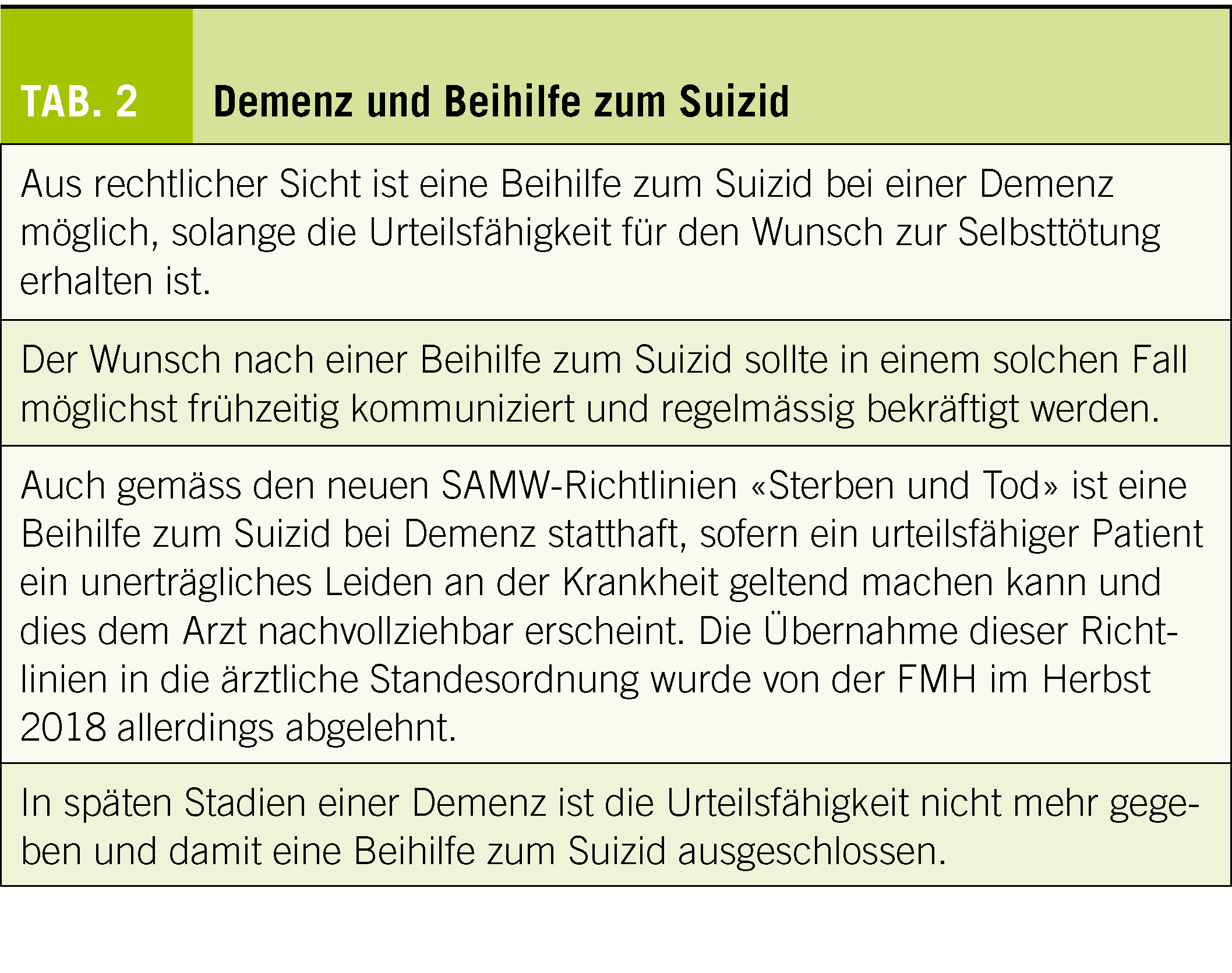 Neben der passiven Sterbehilfe wird in den letzten Jahren in der Schweiz zunehmend auch die Frage diskutiert, ob und unter welchen Umständen einem Ersuchen um Beihilfe zum Suizid auf Grund einer Demenzerkrankung stattgegeben werden kann (Tab. 2). Gesetzlich ist dies im Prinzip möglich, so lange die Urteilsfähigkeit erhalten ist, also in einem frühen oder allenfalls mittleren Demenzstadium. In aller Regel wird dazu ein fachärztliches Gutachten von einem Geriater, Neurologen oder Psychiater verlangt (6). Der Wunsch nach einer Beihilfe zum Suizid sollte von der betroffenen Person möglichst frühzeitig kommuniziert und regelmässig bekräftigt worden sein.