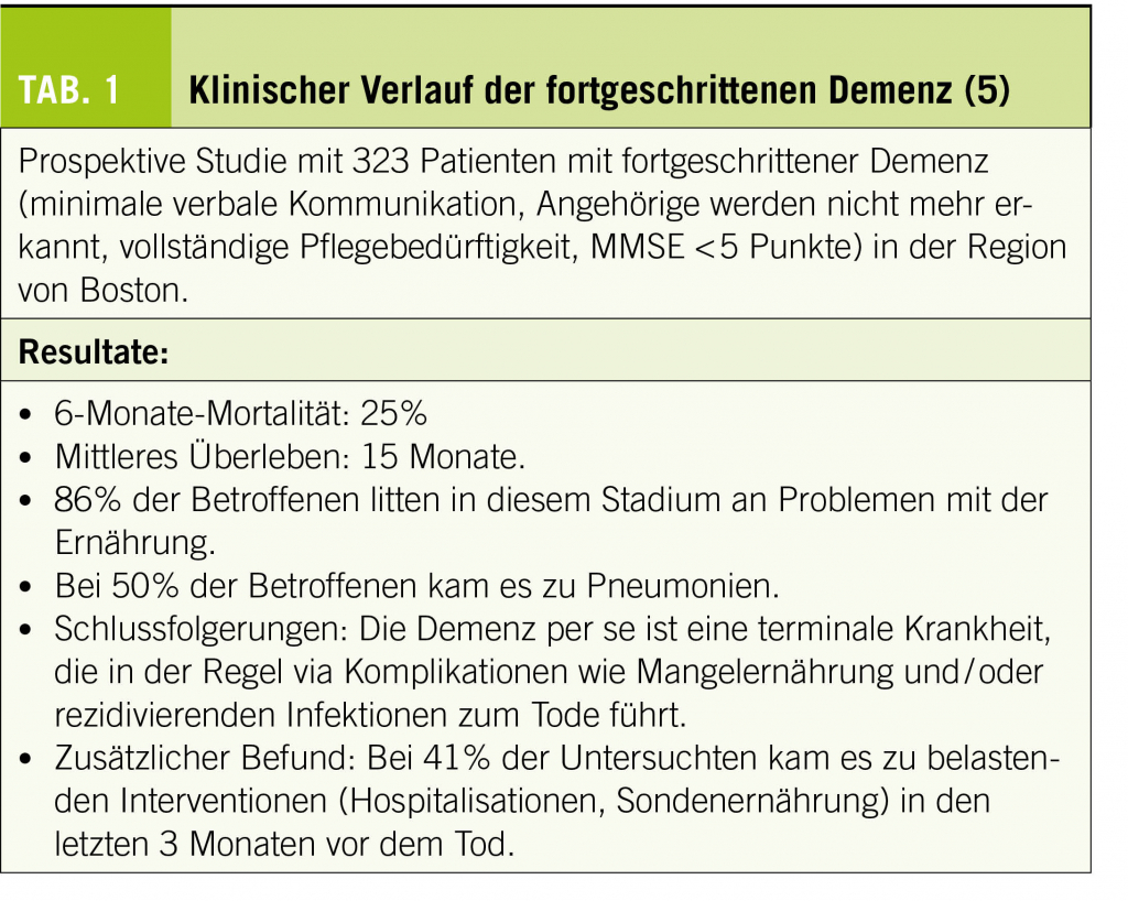 Studien zeigen, dass ab dem Stadium, in dem nur noch eine minimale verbale Kommunikation möglich ist, und gleichzeitig eine vollständige Pflegebedürftigkeit besteht, ein Viertel der Patienten in den folgenden sechs Monaten und fast die Hälfte im folgenden Jahr versterben werden (Tab. 1) (5).
