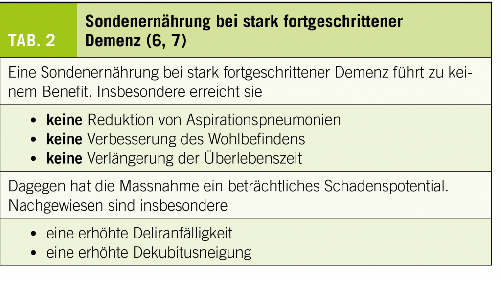 Die Anlage einer PEG-Sonde bei einer fortgeschrittenen Demenz ist kontraindiziert. Diese kann die Nahrungsaufnahme in diesem Stadium nicht verbessern und führt zu keiner Verlängerung der Überlebenszeit. Dagegen sind die Nebenwirkungen (z.B. Aufstossen der zugeführten Nahrung, Gestörtsein durch die Sonde) erheblich. Sie können die Lebensqualität der Patienten schwer beeinträchtigen und führen zu einer erhöhten Deliranfälligkeit (Tab. 2).