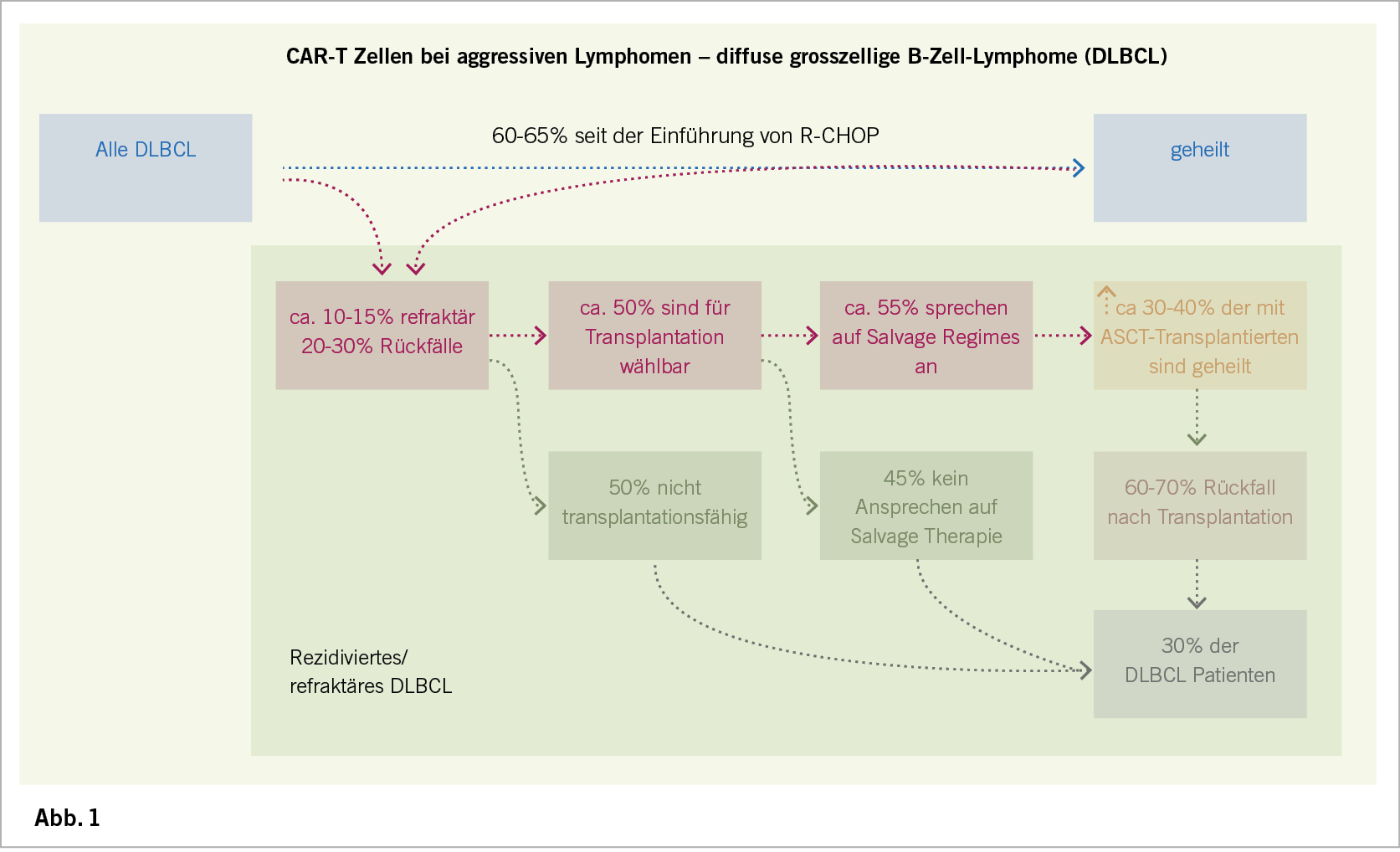 Die Reinigung, Selektion und Herstellung der CAR-T-Zellen (US/Europa) dauert 3-4 Wochen. In SCHOLAR-1, der grössten, gepoolten, retrospektiven Analyse auf Patientenebene zur Charakterisierung der Ansprechrate und des Überlebens bei Patienten mit refraktärem DLBCL lag die objektive Ansprechrate auf die nächste Therapielinie bei 26% (vollständige Ansprechrate 7%), und das mediane Gesamtüberleben betrug 6.3 Monate. Zwanzig Prozent der Patienten waren nach 2 Jahren noch am Leben. Die Ergebnisse waren in allen Studienkohorten gleich schlecht.