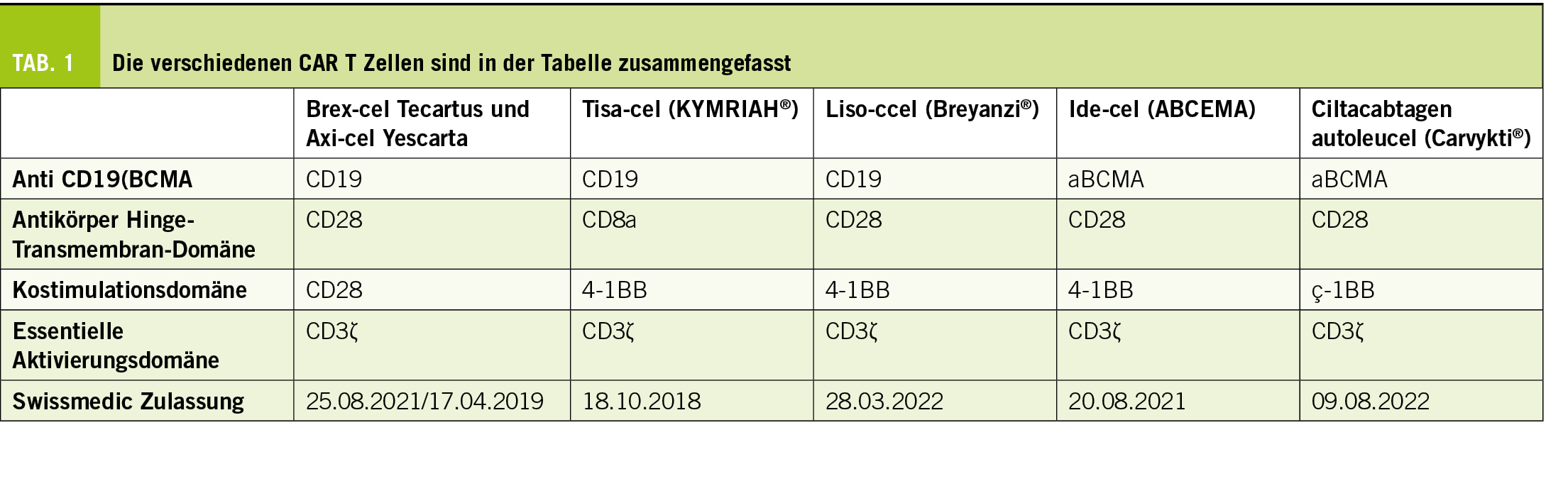 Es existiert eine ganze Reihe von verschiedenen CAR-T-Zellrezeptor-Therapien, die sich in ihrer Spezifität (anti-CD19 oder anti BCMA) unterscheiden, deren Hinge und Transmembranregion unterschiedlich ist (CD28 oder CD8a) und deren Co-Stimulationsdomänen sich unterscheiden (CD28, oder 4-1BB). Die Intensität der CAR-Signalisierung in T-Zellen wird nicht nur durch das Niveau der CAR-Expression, sondern auch durch die Scharnier-(hinge) Domäne beeinflusst. Die Scharnierdomäne reguliert die CAR-Sigalisierungsschwelle und die Transmembrandomäne die Menge der CAR-Signalisierung über die Kontrolle des CAR-Expressionsniveaus.