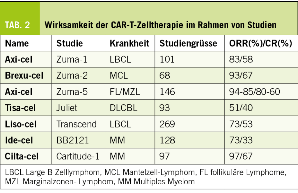 - Die CAR-T-Zelltheraoie ist effektiv beim aggressiven B-Zell-Lymphom und beim rezidivierenden/refraktären multiplen Myelom