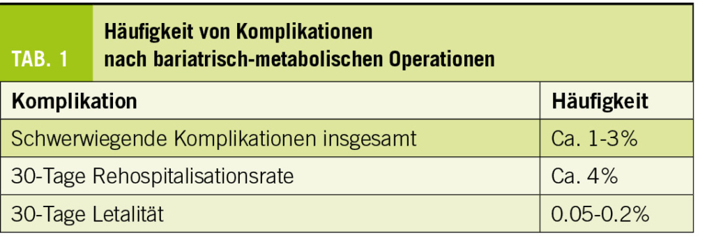Seit Einführung der laparoskopischen, minimal-invasiven Operationstechnik wird die bariatrisch-metabolische Chirurgie in qualifizierten Zentren mit einer sehr geringen Komplikationsrate durchgeführt. In grossen Kohortenstudien und nationalen Registern wird die Wahrscheinlichkeit von schwerwiegenden Komplikationen (z.B. revisionspflichtige Nachblutungen, Klammernahtleckagen oder Anastomoseninsuffizienzen) mit einer Wahrscheinlichkeit von 1–3% angegeben. Etwa 4% der operierten Patienten werden aufgrund eines postoperativen Problems (Wundinfekt, Thrombose, Lungenembolie, Darmpassageproblematik etc.) innerhalb von 30 Tagen erneut hospitalisiert, die 30-Tage-Mortalität beträgt 0.05–0.2% (Tab. 1) (1). Unter Berücksichtigung des anästhesiologischen und chirurgischen Risikoprofils dieses Patientenklientels sind diese Zahlen im Vergleich zu anderen viszeralchirurgischen Eingriffen wie z.B. der Cholezystektomie sehr niedrig. Im mittel- und langfristigen Verlauf ist jedoch in einer variablen Häufigkeit von 5–15% mit Folgeoperationen meist aufgrund unbefriedigenden Gewichtsverlusts oder unklarer abdomineller Schmerzen zu rechnen, welche in den häufigsten Fällen auf innere Hernien (2), symptomatische Gallensteine oder gastroösophagealem Reflux zurückzuführen sind (3). Die entsprechenden potentiellen Komplikationen müssen daher dem nachsorgenden Behandlungsteam zwingend bekannt sein.