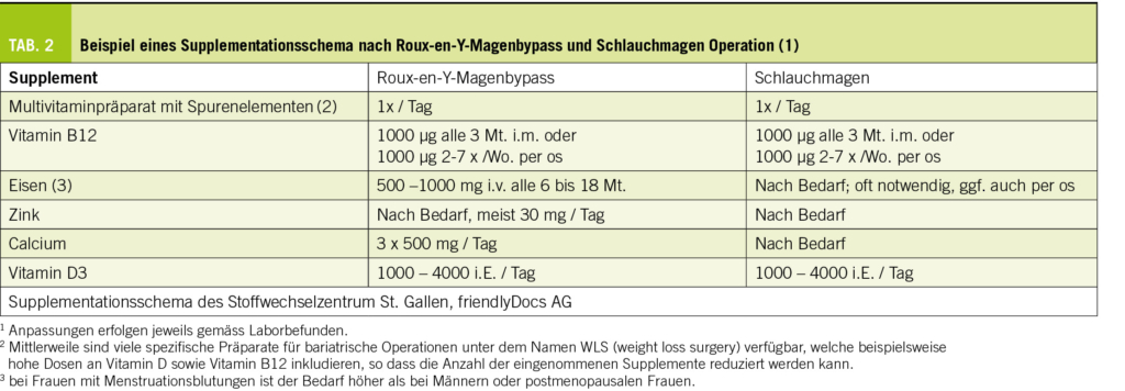 Aufgrund der veränderten Anatomie ist nach fast allen bariatrisch-metabolischen Operationen eine dauerhafte, strukturierte Mikronährstoffsupplementation notwendig. Hierfür haben sich standardisierte Supplementationsschemata, wie in Tabelle 2 dargestellt, etabliert und bewährt. Regelmässige Laborkontrollen entsprechender Parameter und eine konsekutive Anpassung des Supplementationsschemas ist heute Standard in der bariatrischen Nachsorge. Dabei sollten die Laboruntersuchung in den ersten 1-2 Jahren nach der Operation in 3-6 Monatsintervallen durchgeführt werden, danach kann meistens die Kontrollfrequenz auf einmal pro Jahr reduziert werden (4). Eine besondere Situation stellt eine nach einer bariatrischen Operation eingetretene Schwangerschaft dar. Hier sollten die Laborkontrollen in etwa 2-3 Monatsintervallen erfolgen (5). Während den Nachsorgekonsultationen sollte immer eine ausführliche Anamnese hinsichtlich der Adhärenz der Supplementeinnahme erfolgen und gegebenenfalls zur Verbesserung motiviert werden.