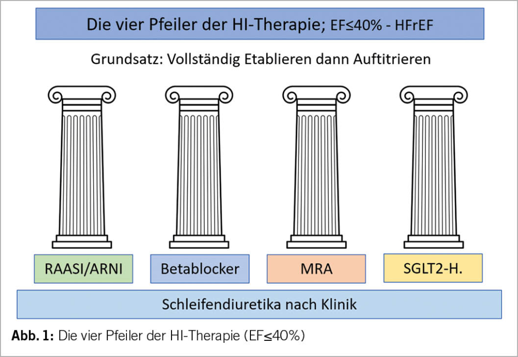 Die Ziele einer HI-Therapie sind: Verbesserung des Überlebens, Verhinderung der HI-Hospitalisationen, Behandlung und Prävention der Symptome, Verbesserung der Lebensqualität und der körperlichen Leistungsfähigkeit. Die vier medikamentösen Pfeiler der HI-Therapie bei einer HFrEF sind in Abbildung 1 ersichtlich.