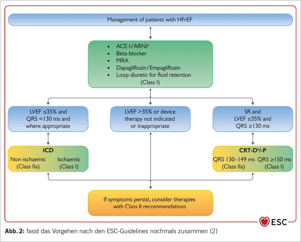 Weiterführende interventionelle (z.B. PCI oder CABG bei ischämischer Kardiomyopathie, PVI eines VHFLi bei HI (IIa), Mitra-Clip (16) bei einer signifikanten funktionellen Mitralklappeninsuffizienz etc.) oder Device-basierte Therapien (z.B. ICD oder CRT-D bei entsprechender Indikation) richten sich nach der zugrundeliegenden kardialen Erkrankung und/oder individuellen Konstellationen.