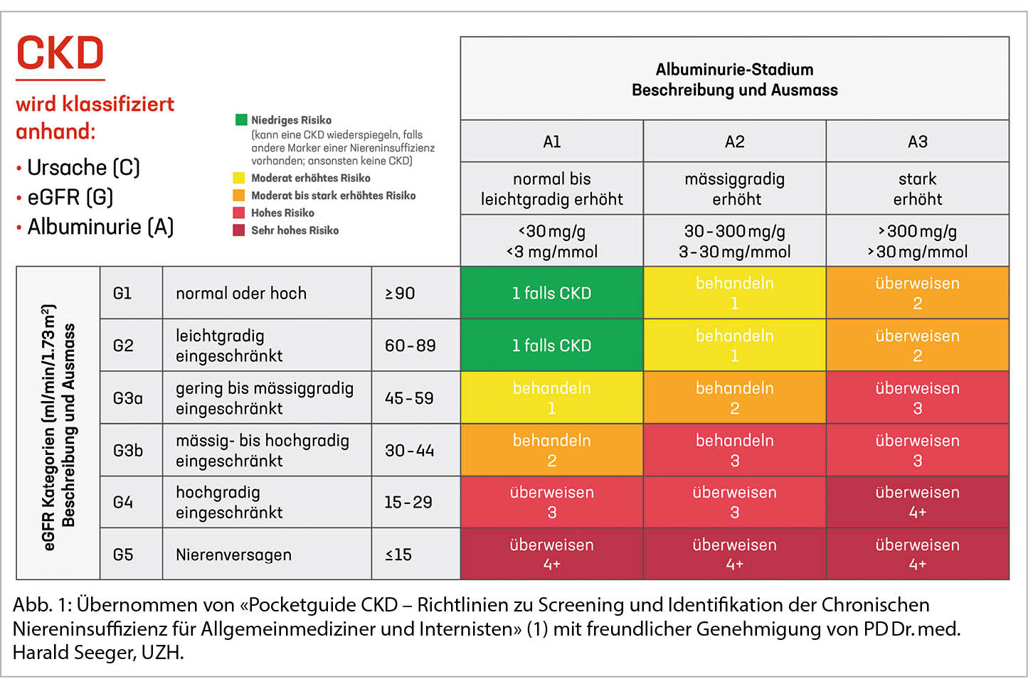 Die Schweizerische Gesellschaft für Nephrologie publizierte neulich einen Pocketguide zum Screening und Identifikation einer CKD. Besonders gefährdete Personen mit arterieller Hypertonie, Diabetes mellitus und Herz Kreislauf Erkrankungen sollten mindestens einmal jährlich auf das Vorliegen einer CKD getestet werden (1). Die CKD Diagnose ist bestätigt, wenn über 3 Monate eine eGFR <60 ml/min/1.73 m2 und/oder eine mässig erhöhte Albuminurie (ACR >30 mg/mmol) nachgewiesen werden kann. Die Abbildung 1 zeigt die CKD-Kategorien anhand von eGFR und Albuminurie, farblich codiert das Risiko für das Fortschreiten der CKD, die Kontrollfrequenz sowie ob eine Überweisung zur nephrologischen Abklärung empfohlen wird.