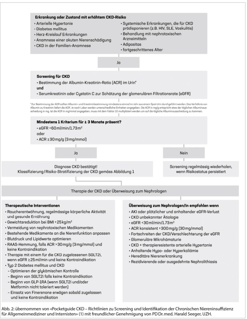 1. Seeger H, de Seigneux S, Cippà P. Pocketguide CKD – Richtlinien zu Screening und Identifikation der Chronischen Niereninsuffizienz für Allgemeinmediziner und Internisten [Internet]. 2021; [Abgerufen am 06.03.2022].