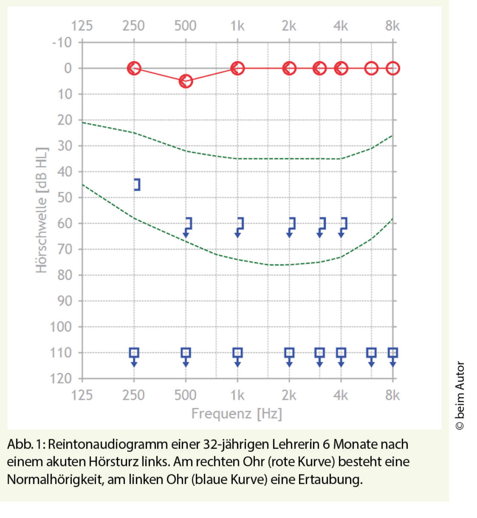 Patienten mit einem akuten Hörsturz können klinisch in der hausärztlichen Notfallpraxis mittels gezielter Anamnese, Otoskopie und Stimmgabelprüfungen schlüssig triagiert werden. Die definitive Diagnose eines Hörsturzes und das Ausmass des Hörverlustes werden mittels Tonaudiometrie festgehalten. Die Therapie eines Hörsturzes stellt in der Behandlung zwar keinen Notfall, jedoch einen Eilfall dar. Da die Ätiologie eines akuten Hörsturzes weiterhin unklar ist, kann keine kausale Therapie durchgeführt werden. An den meisten Zentren wird eine empirische Therapie mit topischen oder systemischen Corticosteroiden in Abhängigkeit des Schweregrades angewendet. Diese Therapie sollte in den ersten 48 Stunden nach Auftreten des Hörsturzes begonnen werden. Das Ausmass des Hörverlusts stellt einen prognostischen Faktor für die Erholung eines Hörsturzes dar. Führt der Hörsturz zu einer höchstgradigen Schwerhörigkeit oder einer Ertaubung (Abb. 1), ist die Prognose ungünstig und nur in Einzelfällen mit einer Erholung zu rechnen.