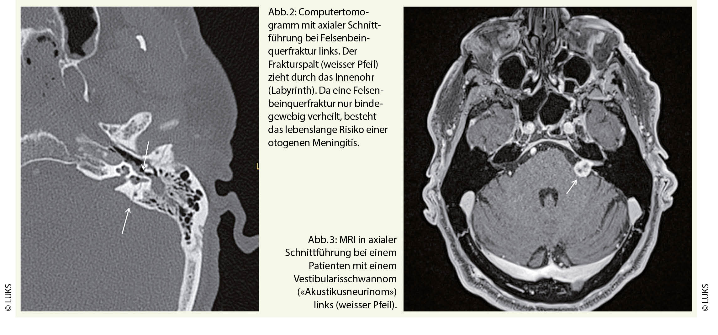 Eine Felsenbeinfraktur wird in der Computertomographie bestätigt. Da bei einer Felsenbeinquerfraktur die Ursache für eine Ertaubung offensichtlich ist, benötigt es keine weiteren Abklärungen. Demgegenüber muss bei einer Ertaubung nach einem Hörsturz im Verlauf eine intra- oder retrocochleäre Pathologie wie ein Vestibularisschwannom («Akustikusneurinom») ausgeschlossen werden (Abb. 3)
